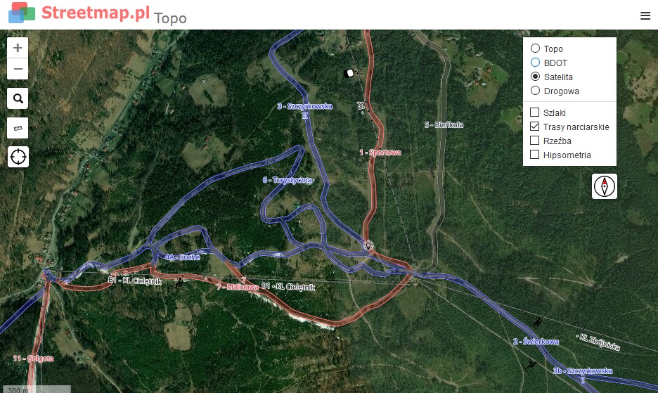 Trasy i wyciągi narciarskie na podkładzie zdjęć satelitarnych